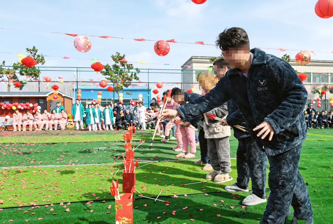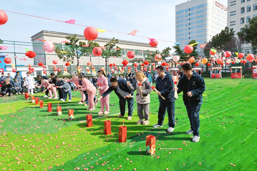 “加油!加油!”随着一声哨响,“一马当先·摇元宵”比赛率先点燃全场。圆滚滚的汤圆欢快跳跃,一分钟内摇出最多者赢得满堂喝彩。紧接着,“马上有福·投壶”考验手眼协调,患者屏息凝神,箭矢破空,精准落入壶中,掌声与欢呼此起彼伏。